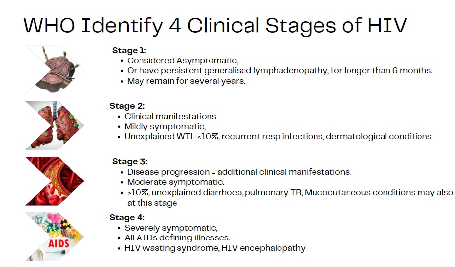 Stage 4 based on the WHO clinical criteria identifies AIDS, which is accompanied with wasting syndrome, encephalopathy, and risks to certain cancers.8