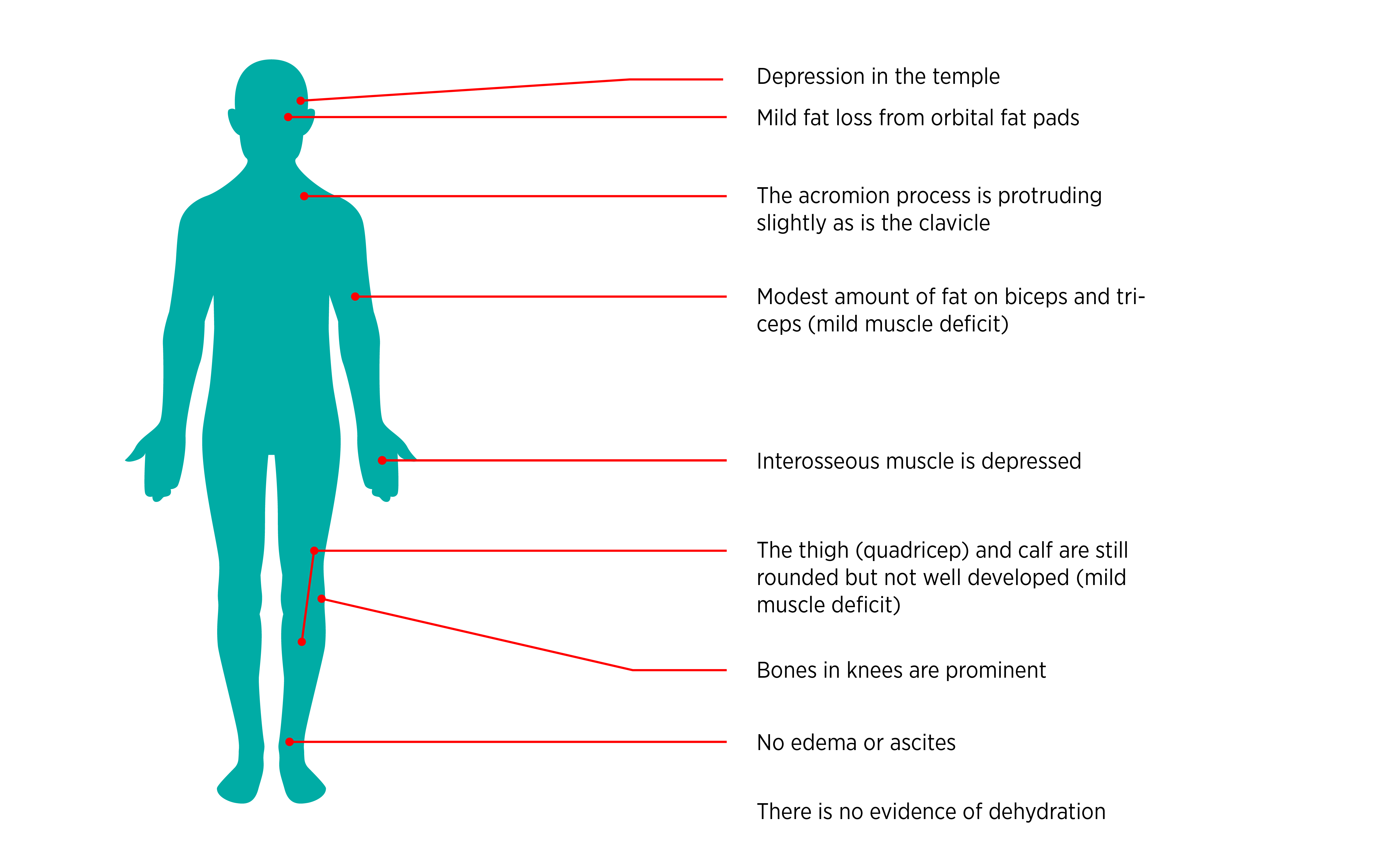 You conduct a PG-SGA to confirm your diagnosis. For the Physical Exam component of the PG-SGA (7. Worksheet 4 - Physical Exam) you note the following. Your examination findings are in red.